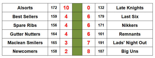 Last Six took the title thanks to their 6-4 win over Best Sellers which left Lads' Night Out with too much to do against Maclean Smilers - they could only manage a 7-3 victory when a 10-0 whitewash was required to unseat the champions. It was the closest finish to a season in a while, but Six's experience won out in the end - this is their 3rd title, and they've finished first or second in the last 3 seasons. Lads will look at their pin average of nearly 186 and wonder how that didn't translate into taking the league - but it is points, not pins, that win out in this game.